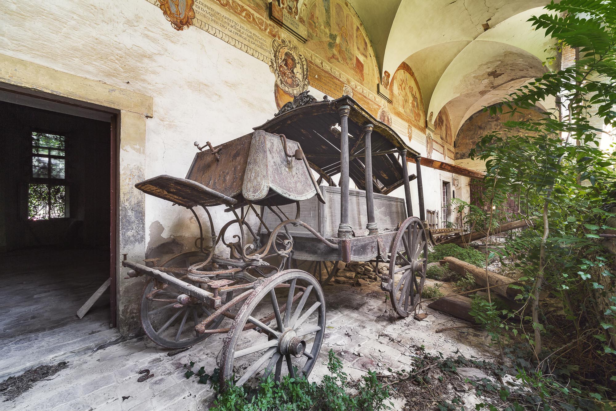 Eine uralte hölzerne Leichenkutsche liegt vergessen im Innenhof eines alten Klosters in Mittelitalien