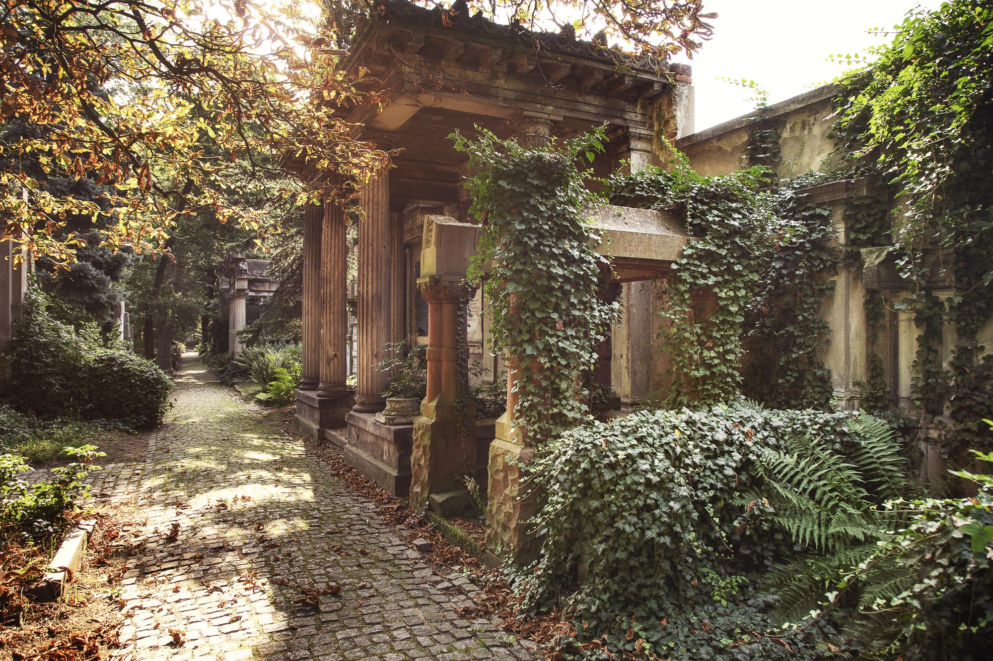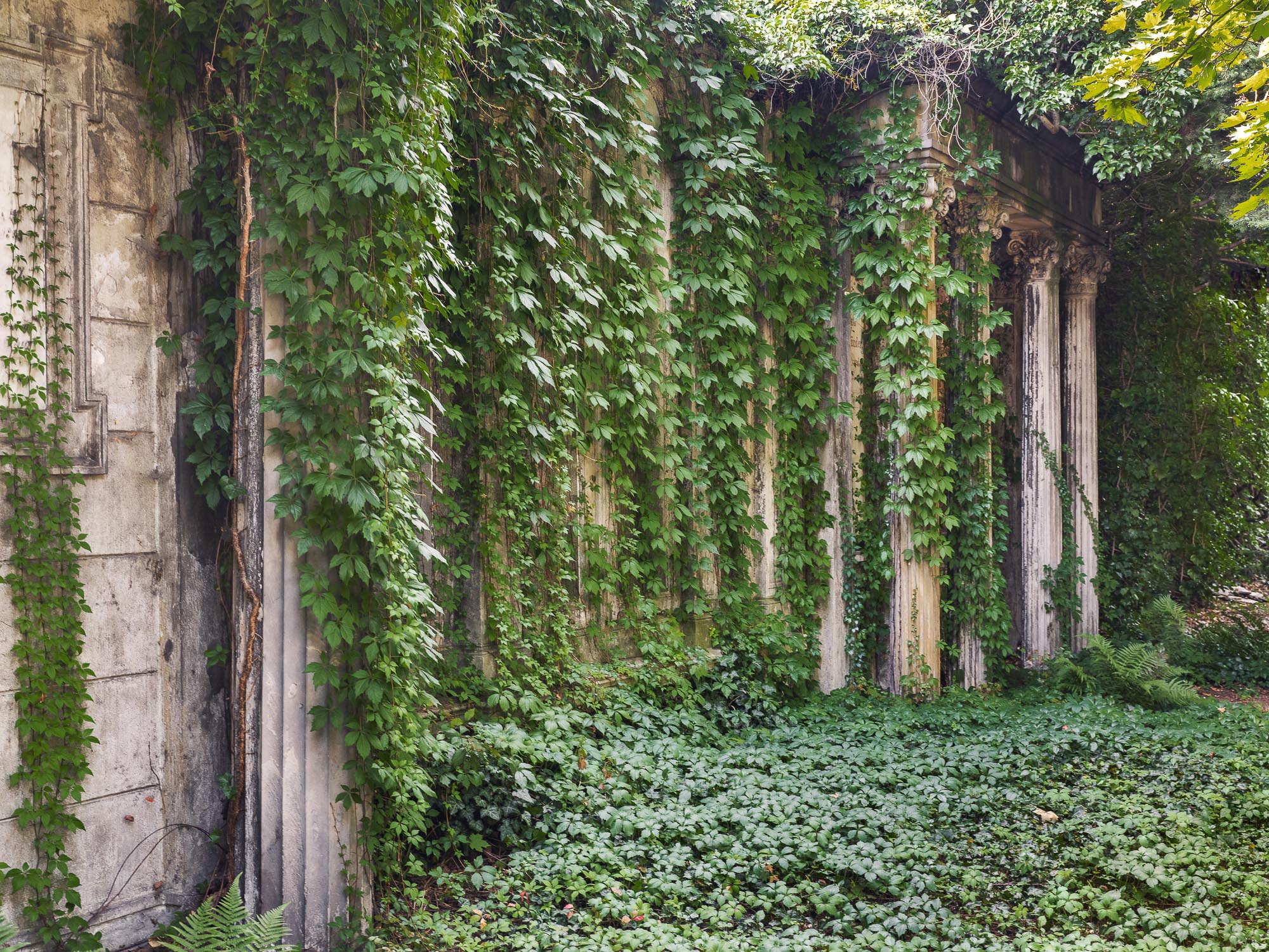Vorhang aus Efeu, der an und um die Säulen wächst.